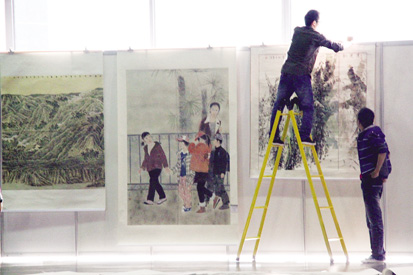 昨天,會(huì)展中心的工作人員正在緊張布展