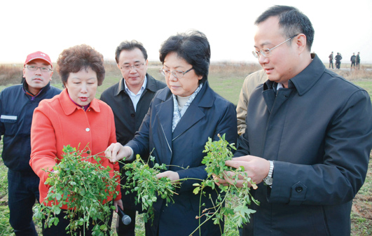 3日下午,李斌一行首先來到位于五河縣朱頂鎮(zhèn)的全國(guó)最大的紫花苜蓿生產(chǎn)基地——秋實(shí)草業(yè)有限公司調(diào)研。在市委書記周春雨、代市長(zhǎng)白金明的陪同下,李斌深入田間察看牧草長(zhǎng)勢(shì),當(dāng)她得知牧草品質(zhì)上乘,草場(chǎng)機(jī)械化作業(yè)達(dá)到世界先進(jìn)水平時(shí),不住地點(diǎn)頭稱贊。調(diào)研中,李斌和在這里打工的女拖拉機(jī)手、朱頂鎮(zhèn)小柳村村民劉小紅拉起家常,希望她通過自己的努力過上更加幸福美好的生活。